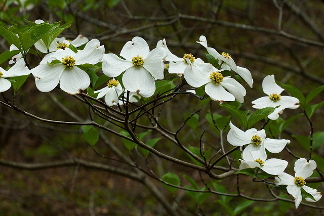 Spring dogwood flowers (Cornus florida); photo by Tom Potterfield on Flickr (noncommercial use permitted with attribution / share alike).
