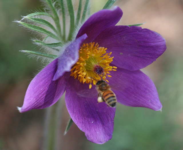 Pasque flower and bee; photo by Hillarie on Flickr (noncommercial use permitted with attribution / no derivative works).