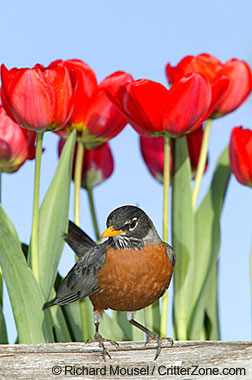 American robin in tulips; photo © Richard Mousel/CritterZone: Animal - Wildlife -Nature Stock Photography (all rights reserved; used by permission).
